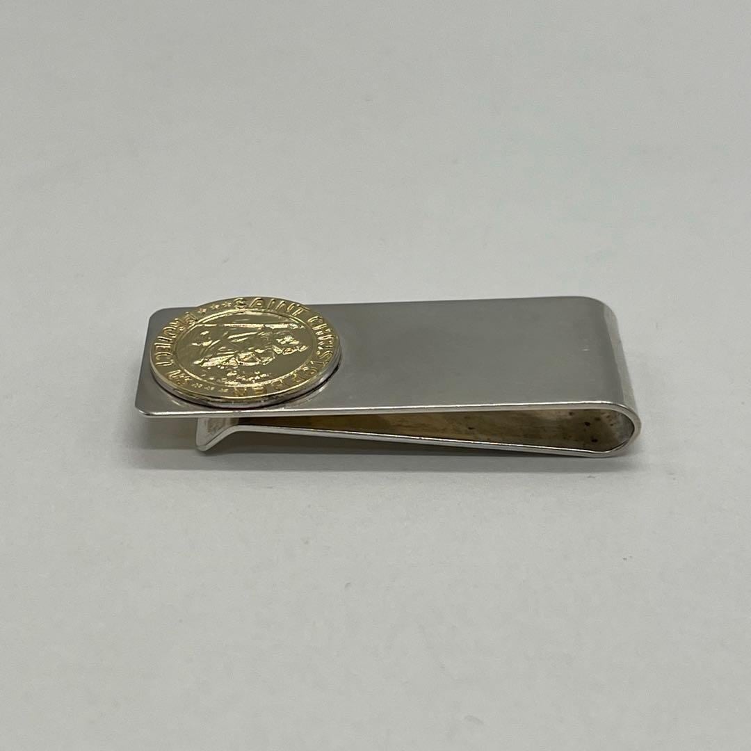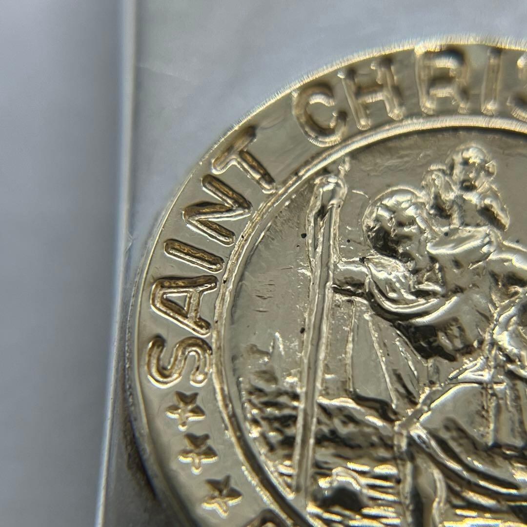 ゴールド素材のセントクリストファーのコインが装飾されたマネークリップは、高級感のある上品な印象がございます。