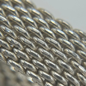ボリュームのあるリング幅にメッシュのデザインはハードな印象を与えにくく、メッシュ1つ1つが光を反射する為輝きのある上品な印象でございます。