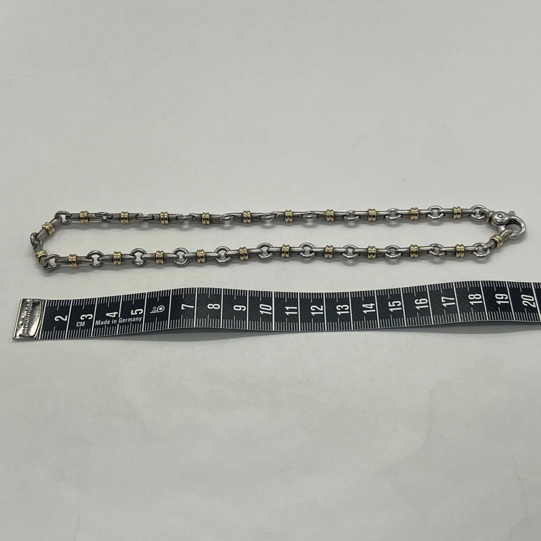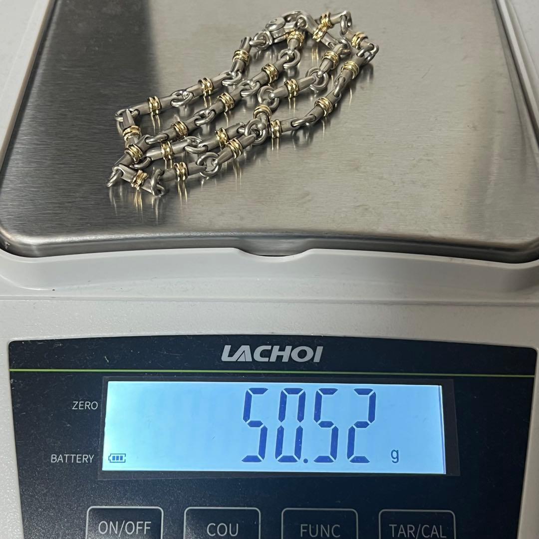 サークルとバーのリンクが交互に連なったデザインのネックレスで、バーの中央にはゴールドが装飾されておりシルバーとゴールドの組み合わせが着用時に上品な印象でございます。