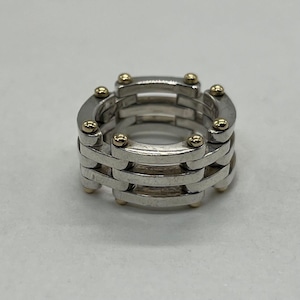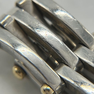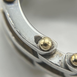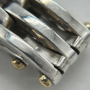 ヴィンテージティファニーで人気のゲートのデザインはリンクの繋ぎ目部分に金のピンが装飾されており、洗練されたデザインは着用時に存在感のあるお品物でございます。